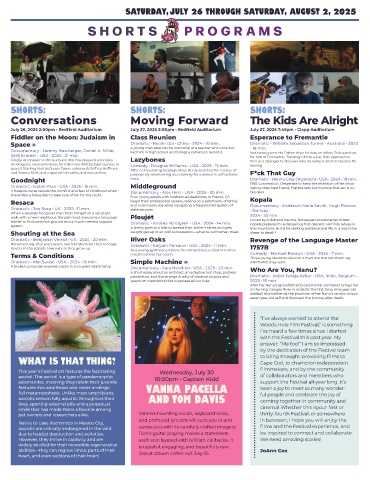 This year’s Festival art features the fascinating Wednesday, July 30 filmmakers, and by the community