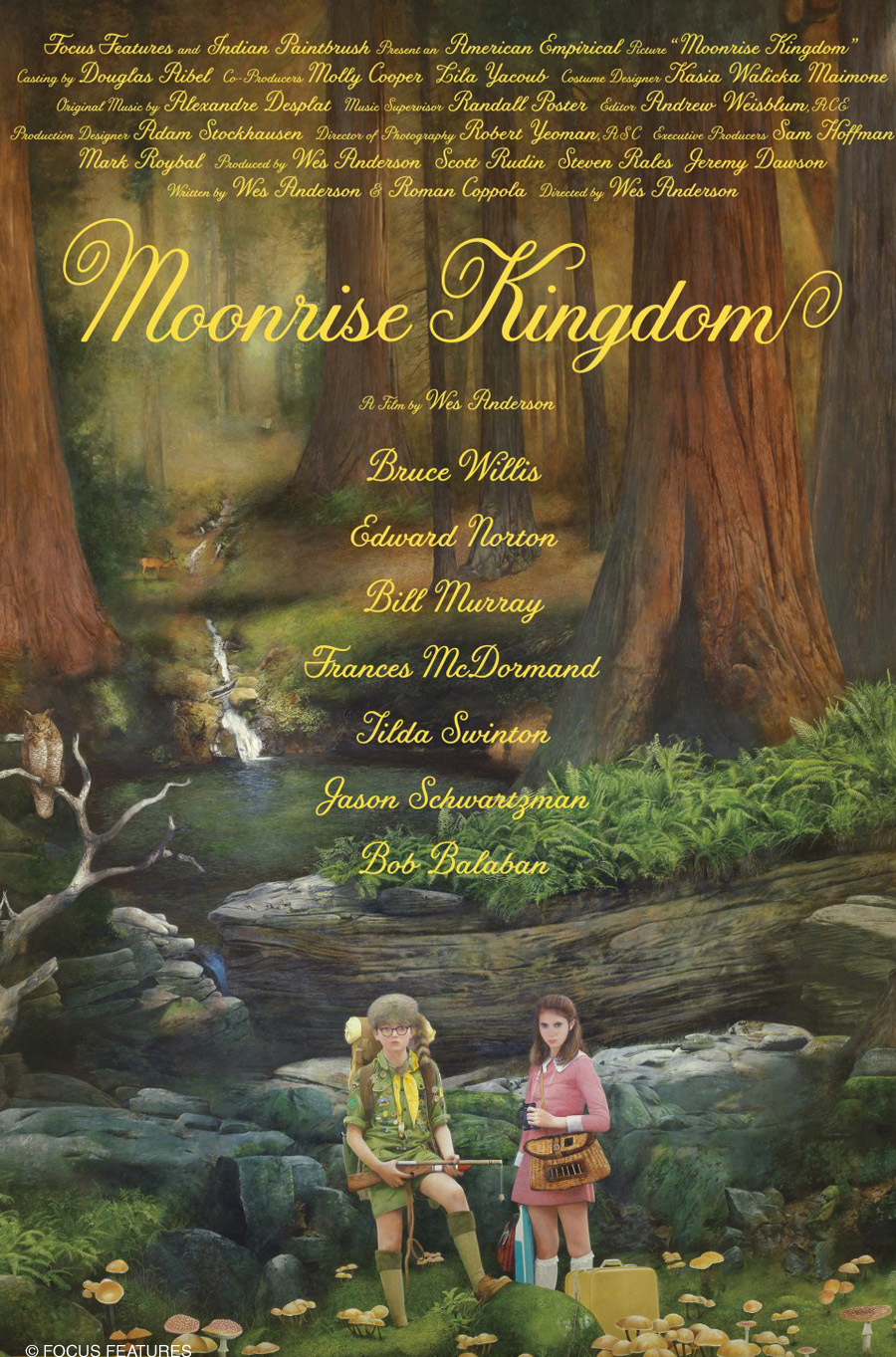 Set on an island off the coast of New England in the summer of 1965, Moonrise Kingdom tells the story of two 12-year-olds who fall in love, make a secret pact, and run away together into the wilderness. As various authorities try to hunt them down, a violent storm is brewing off-shore – and the peaceful island community is turned upside down in every which way. Bruce Willis plays the local sheriff, Captain Sharp. Edward Norton is a Khaki Scout troop leader, Scout Master Ward. Bill Murray and Frances McDormand portray the young girl’s parents, Mr. and Mrs. Bishop. The cast also includes Tilda Swinton, Jason Schwartzman, and Bob Balaban; and introduces Jared Gilman and Kara Hayward as Sam and Suzy, the boy and girl. Feature film by Wes Anderson