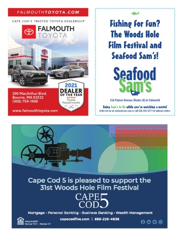 Fishing for fun? The Woods Hole Film Festival and Seafood Sam’s! 356 Palmer Avenue (Route 28) in Falmouth Enjoy Sam’s to Go while you’re watching a movie! Order online at seafoodsams.com or call 508.540.7877 for takeout orders.